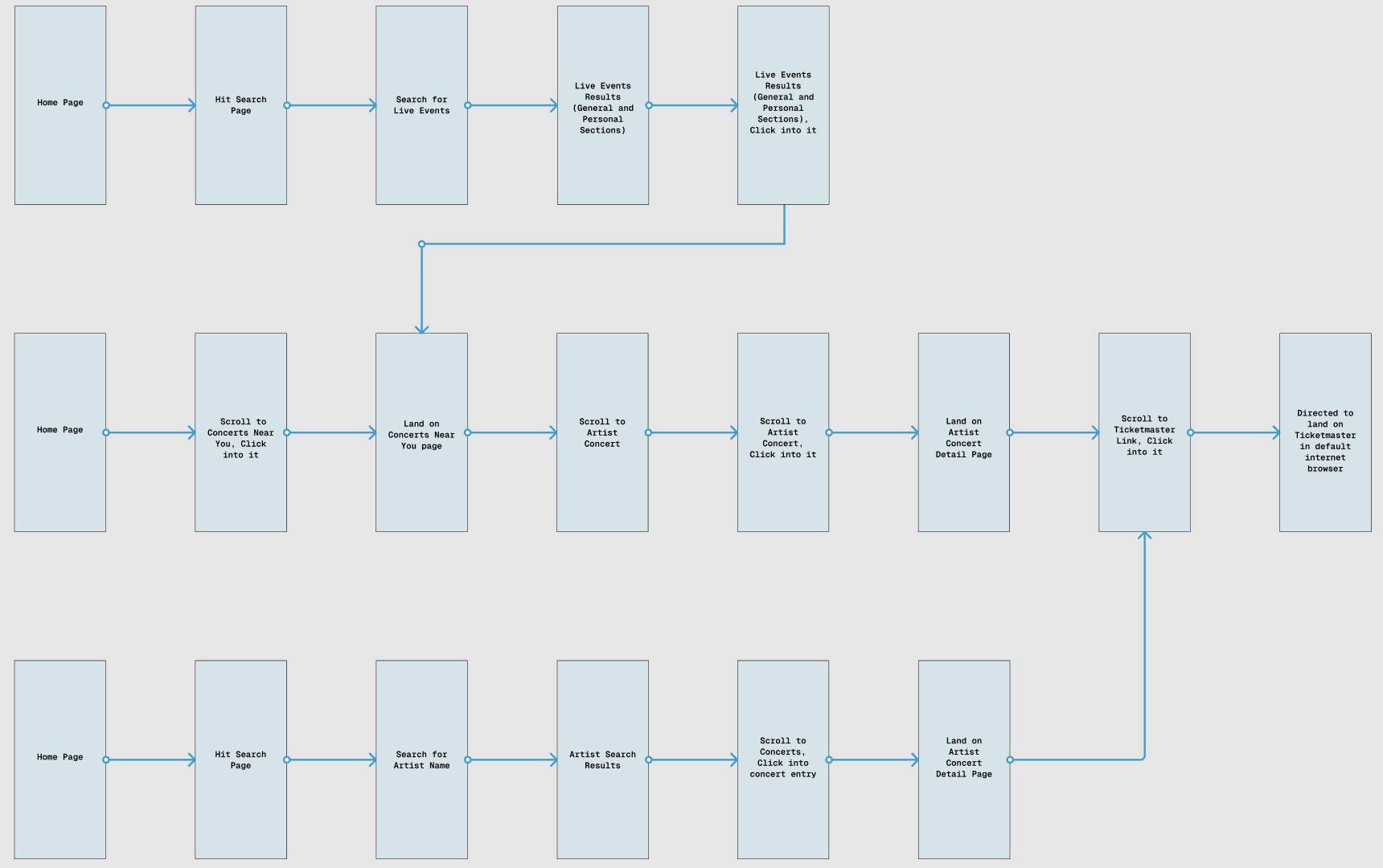 I began with a crucial step, which was laying out the user flow. During this phase, the core of the work was actually user flow and information architecture, not UI polish. Because the “Concerts Near You” feature is embedded within Apple Music’s existing ecosystem and not a standalone product, the main challenge was determining where the feature should live, and how users would naturally discover it.