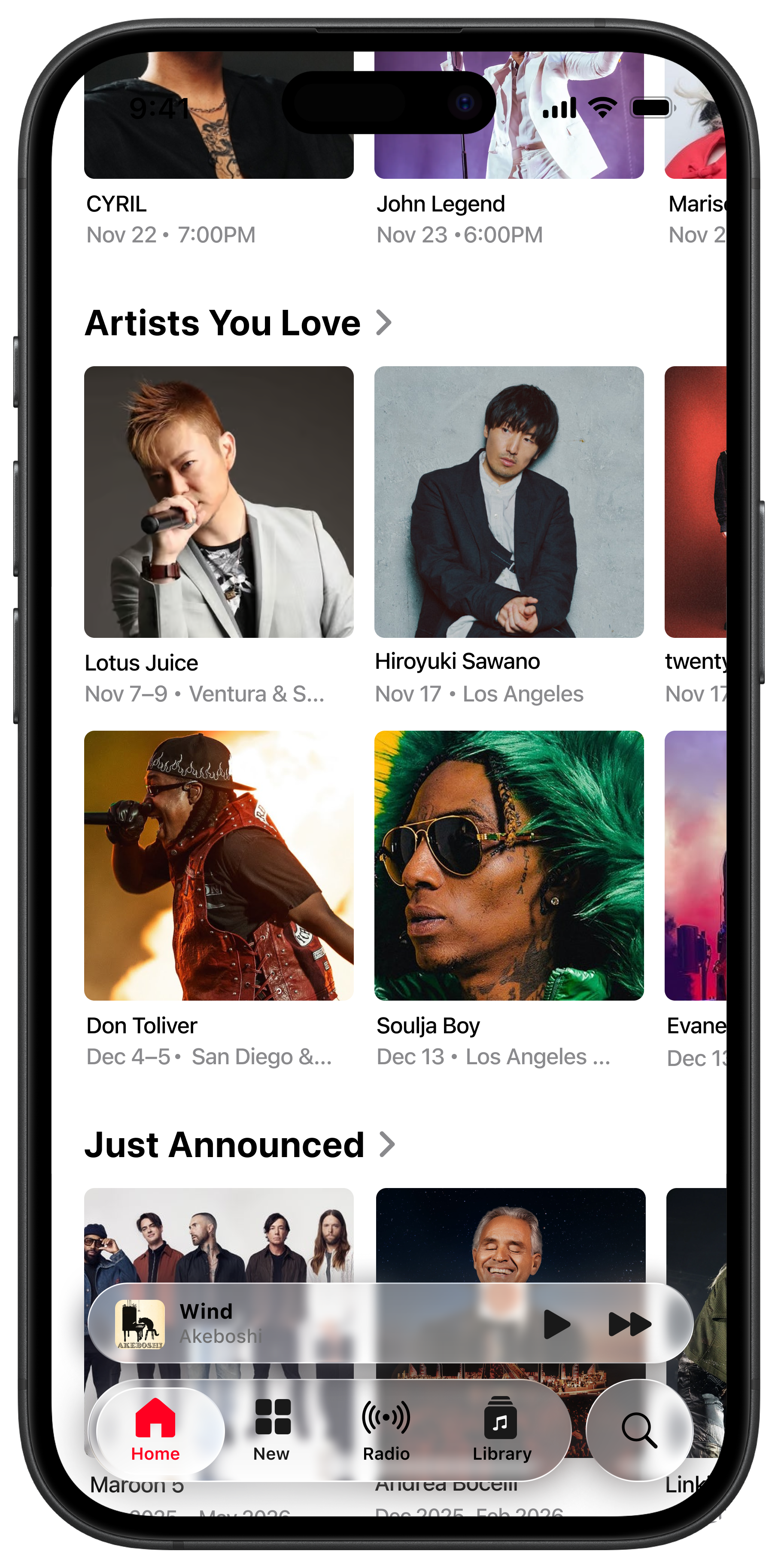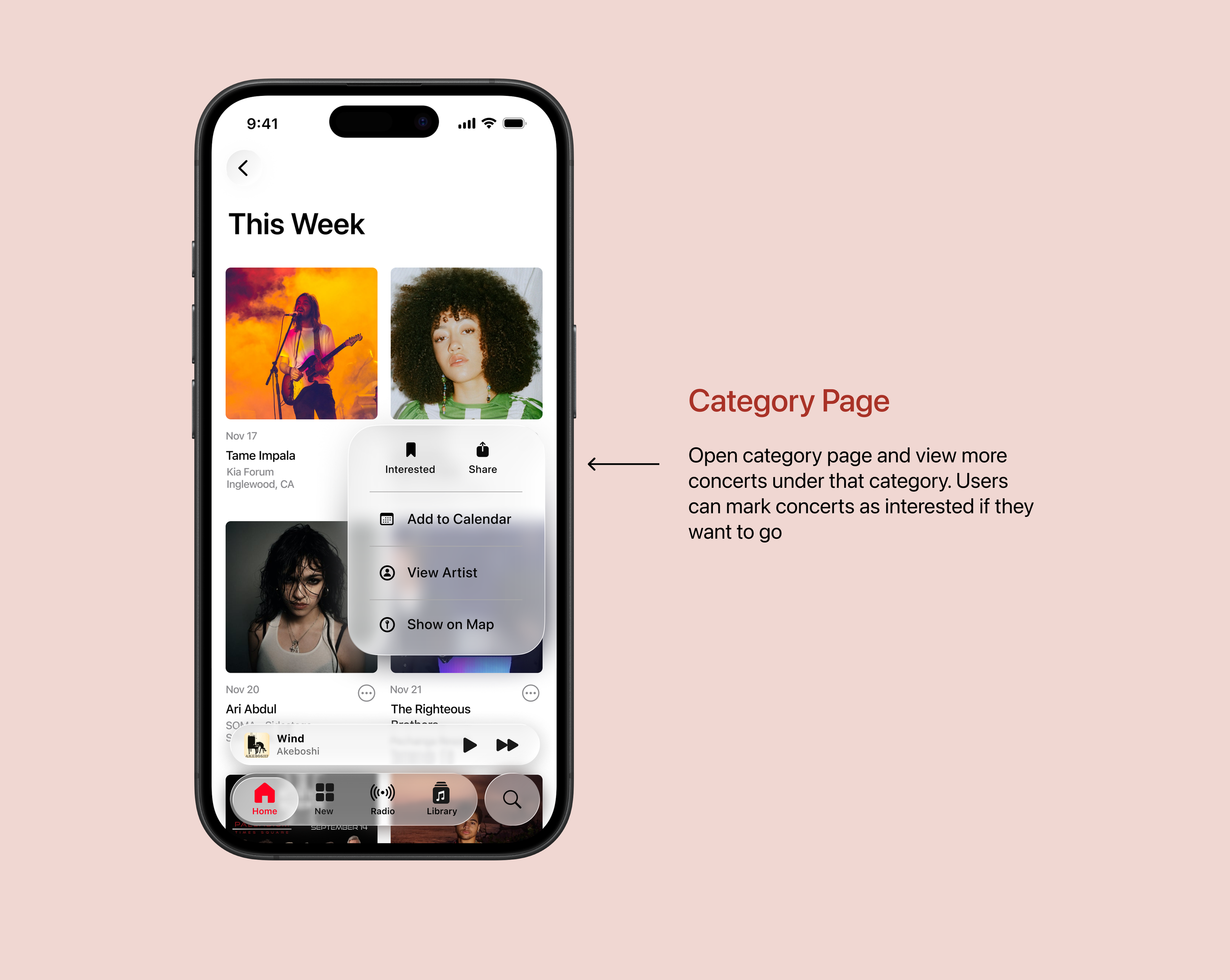This section is in the Home Tab, and shows up as the third section while scrolling. The Home Tab is where Apple Music shows things with personalized and ongoing value. Listening and discovery mutually coexist here. For placement of the Concerts section, the Home Tab was ultimately chosen instead of the New Tab, because New is understood as new releases and editorial content.