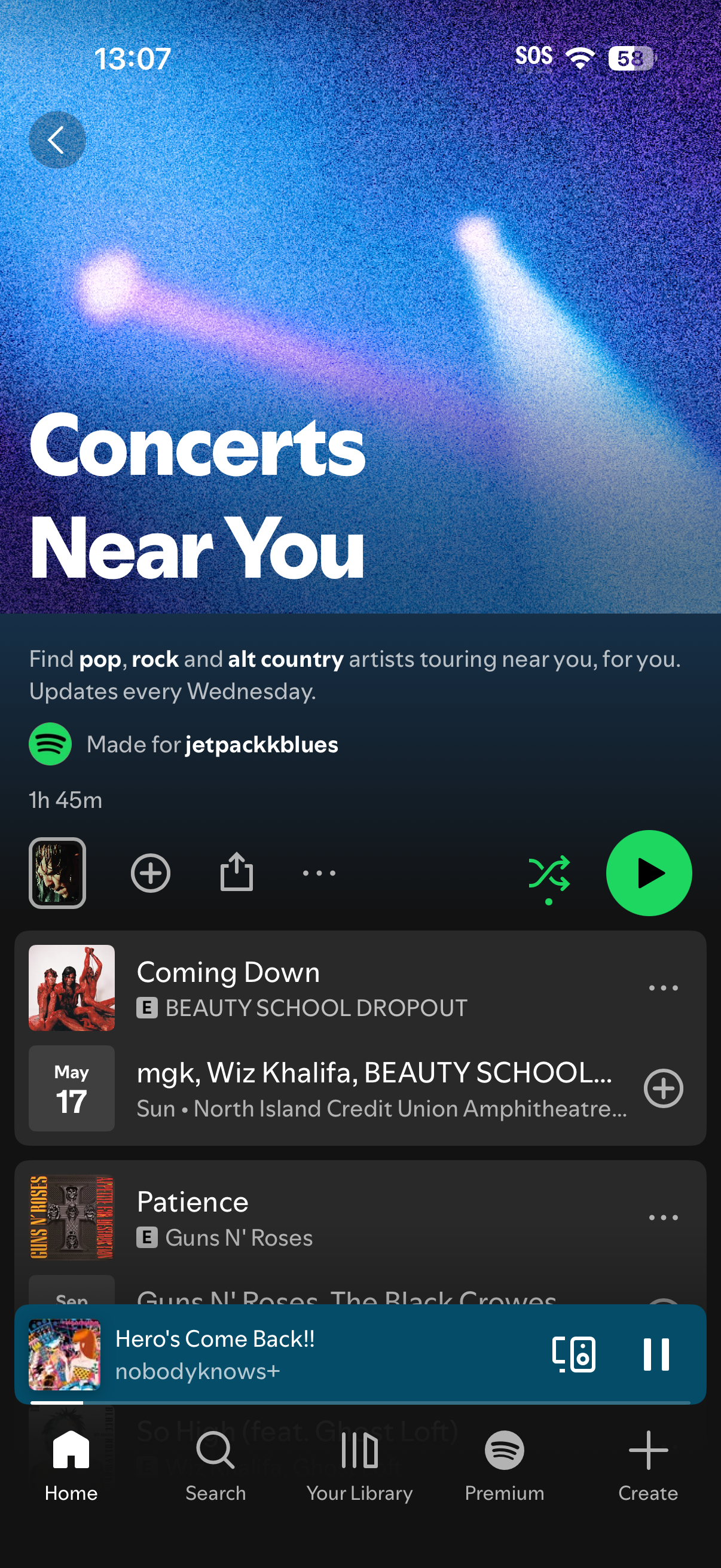 Now that the user has pressed on the Concerts Near You page, the subsections open up to two rows, and there are three categories total: concerts happening this week, concerts from artists in your library, and tours that have just been announced.