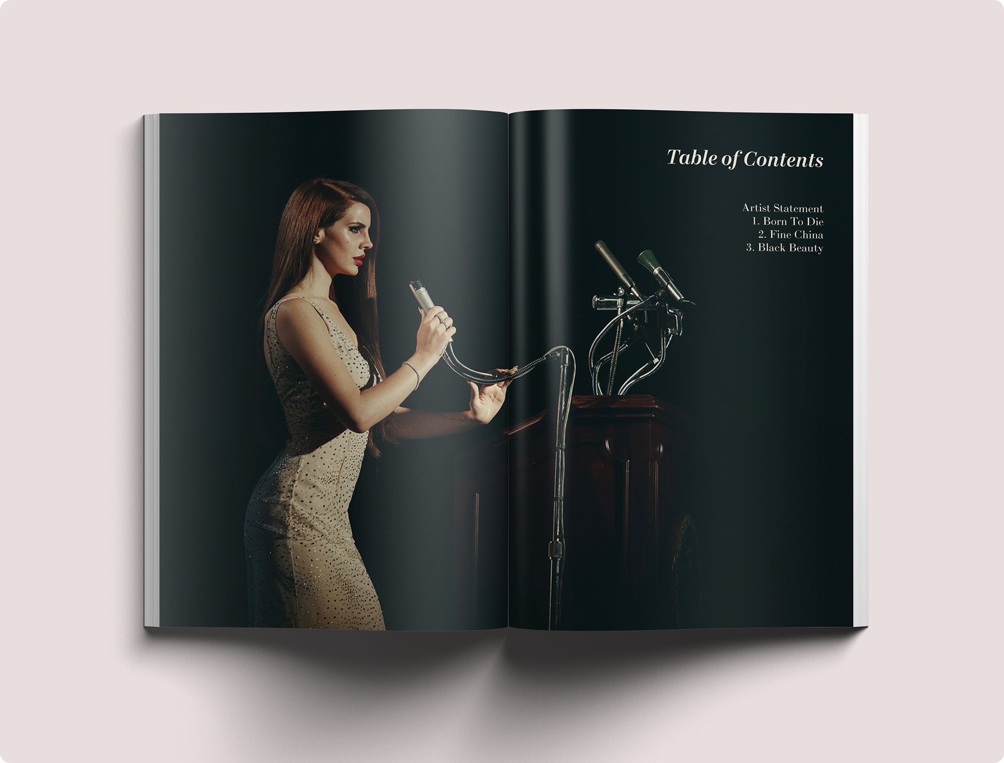 Carmen, Carmen is a fanzine which explores the world of singer and songwriter Lana del Rey. It examines the possibilities of other mediums where Lana del Rey could also showcase her artistry, such as if she were also an author or an actress. The zine contains tailored collages I created for each possibility, which are visual representations of her atmospheric, flowery music.