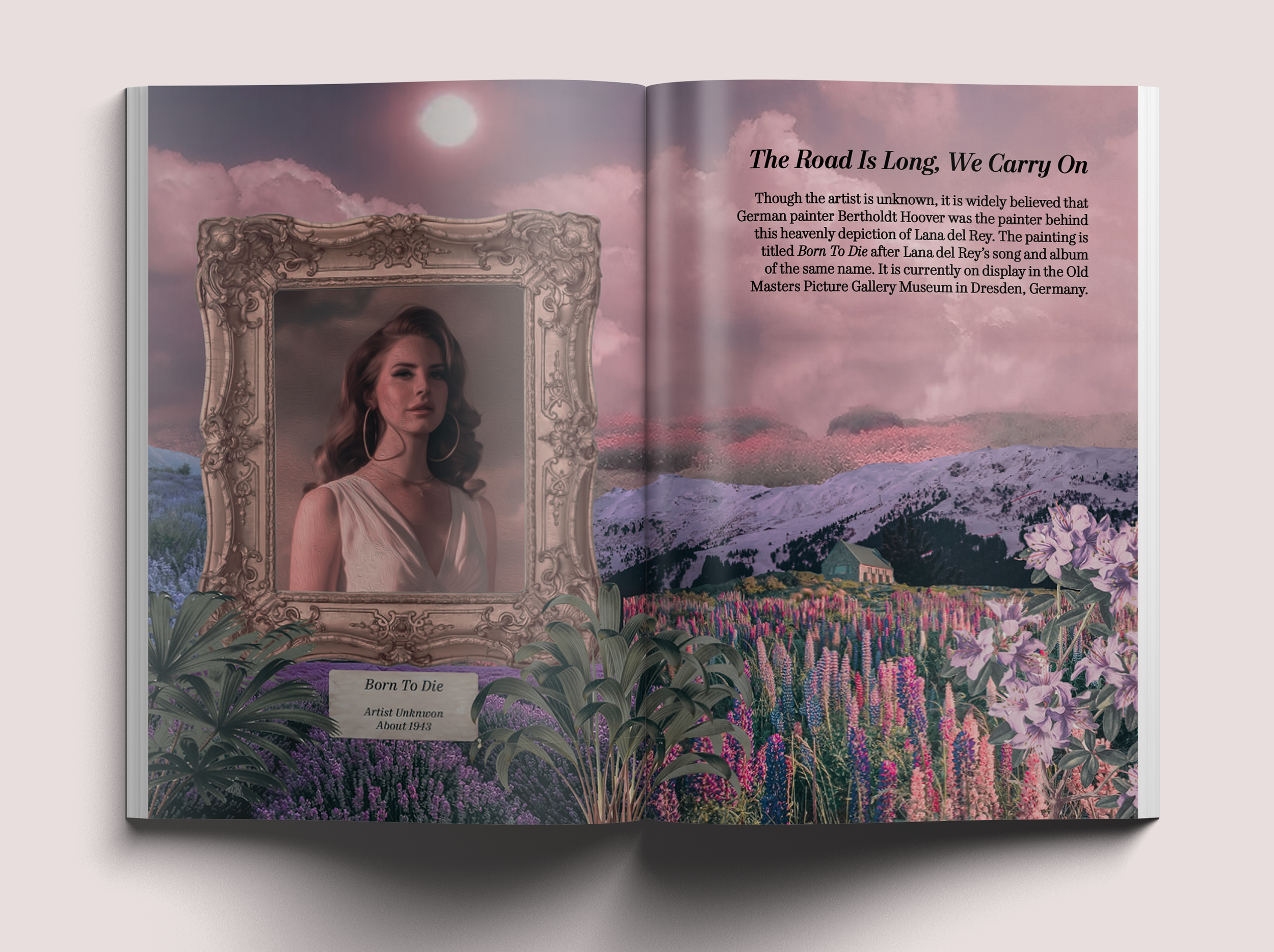 One of my all-time favorite Lana del Rey songs is Born to Die, a lush, cinematic elegy to a doomed love. In the world this zine explores Born to Die, as a painting too, not just a song. The fictional myth of this painting is that no one knows who painted it, but it depicts Lana del Rey as a goddess amongst the clouds.