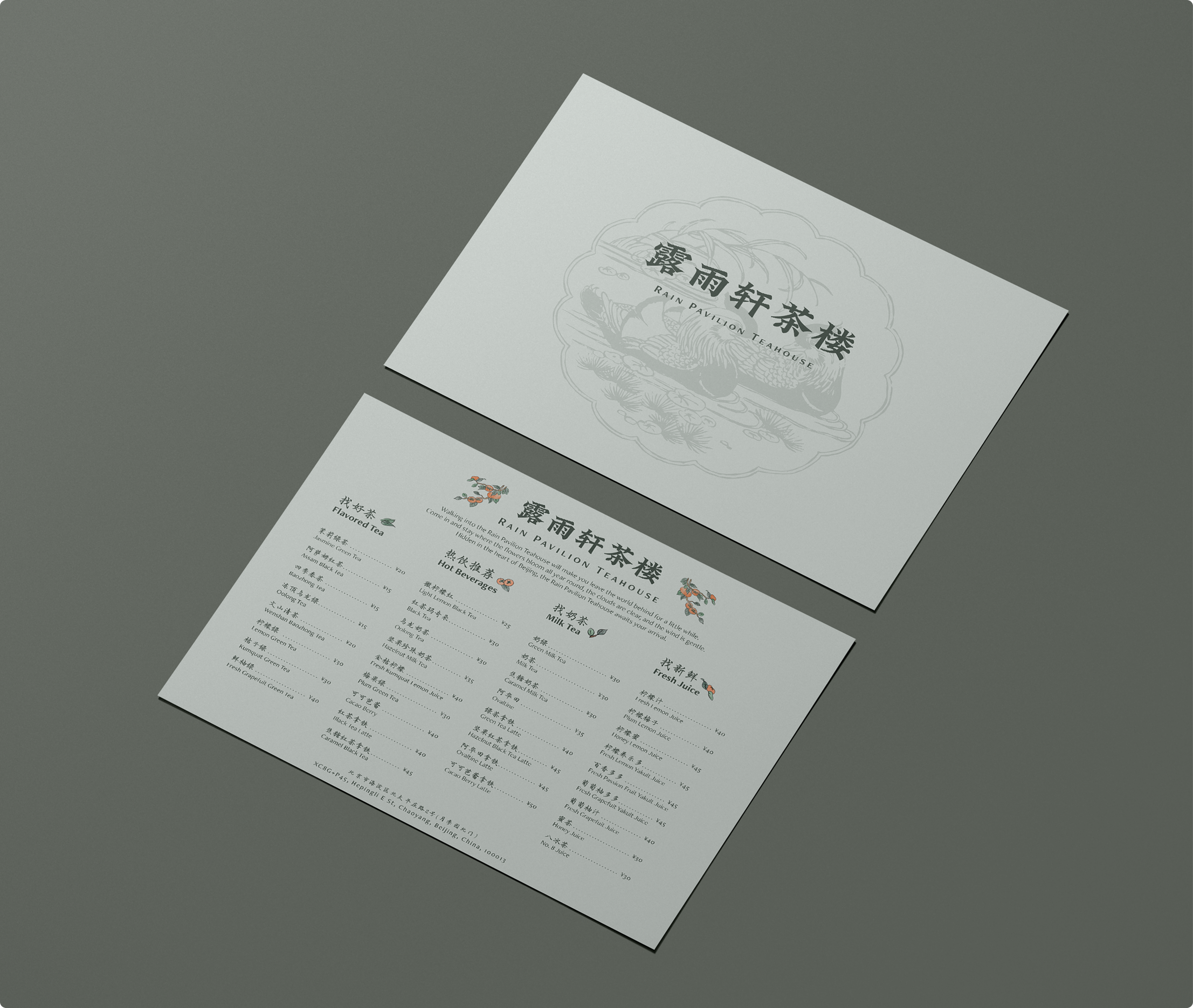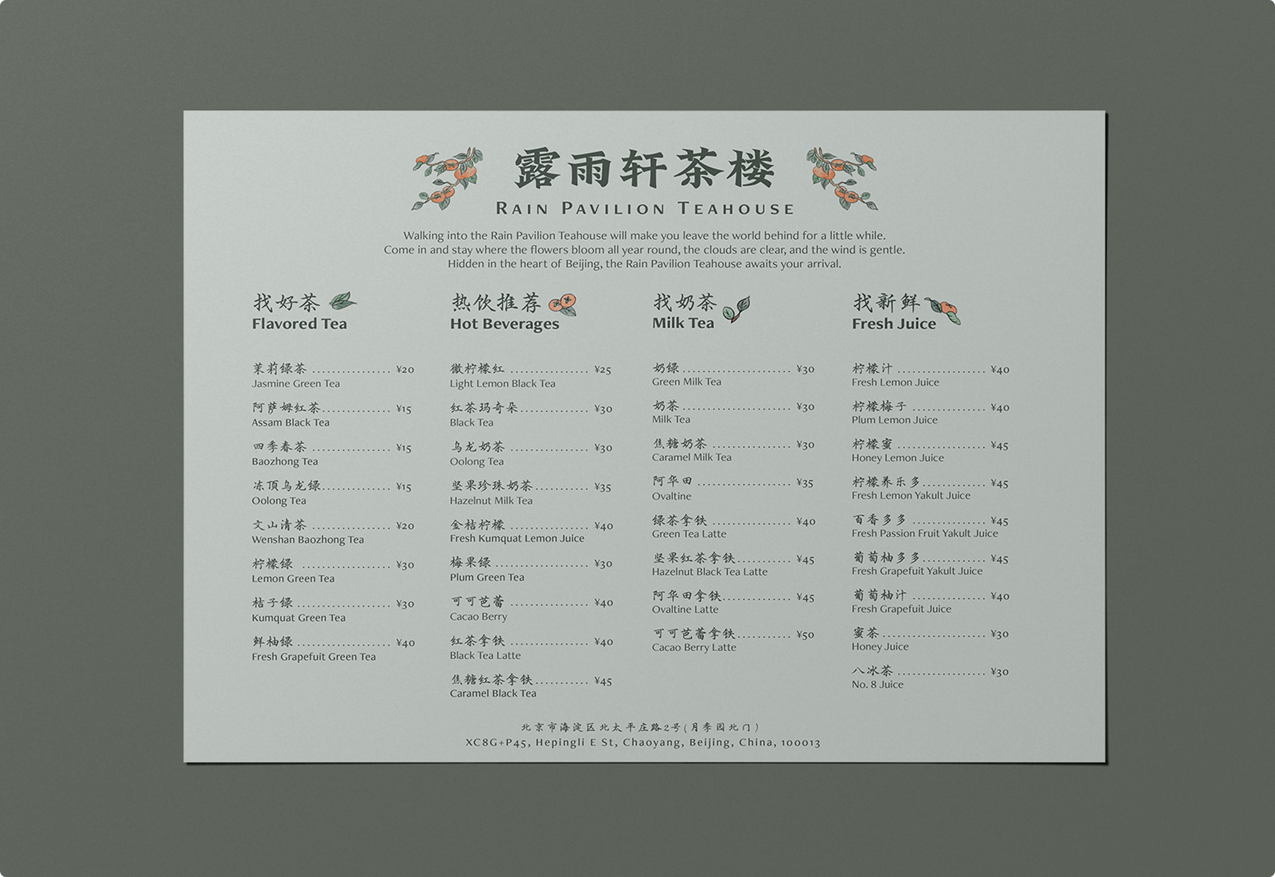 Before I added in my illustrations, the menu looked almost too clean. It didn’t communicate the lush and soothing interior of the actual teahouse. I did a bit of research on what kinds of plants are common on Chinese porcelain, and decided to draw small persimmon branches.