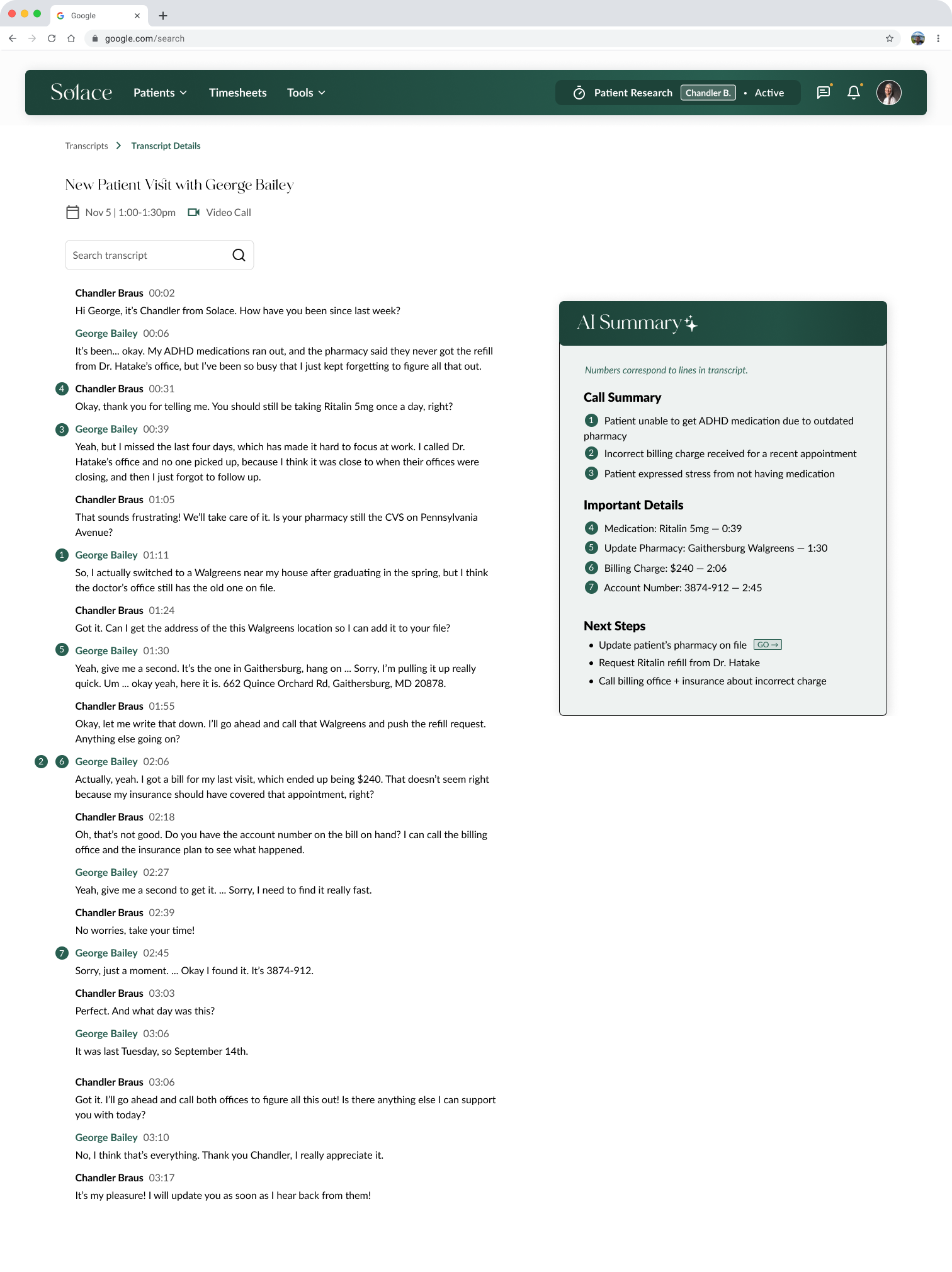Solace’s healthcare advocate dashboard had a transcript feature, which allowed the advocate to review phone call conversations with patients. But it required manually scanning through dense lines of dialogue to find critical details.