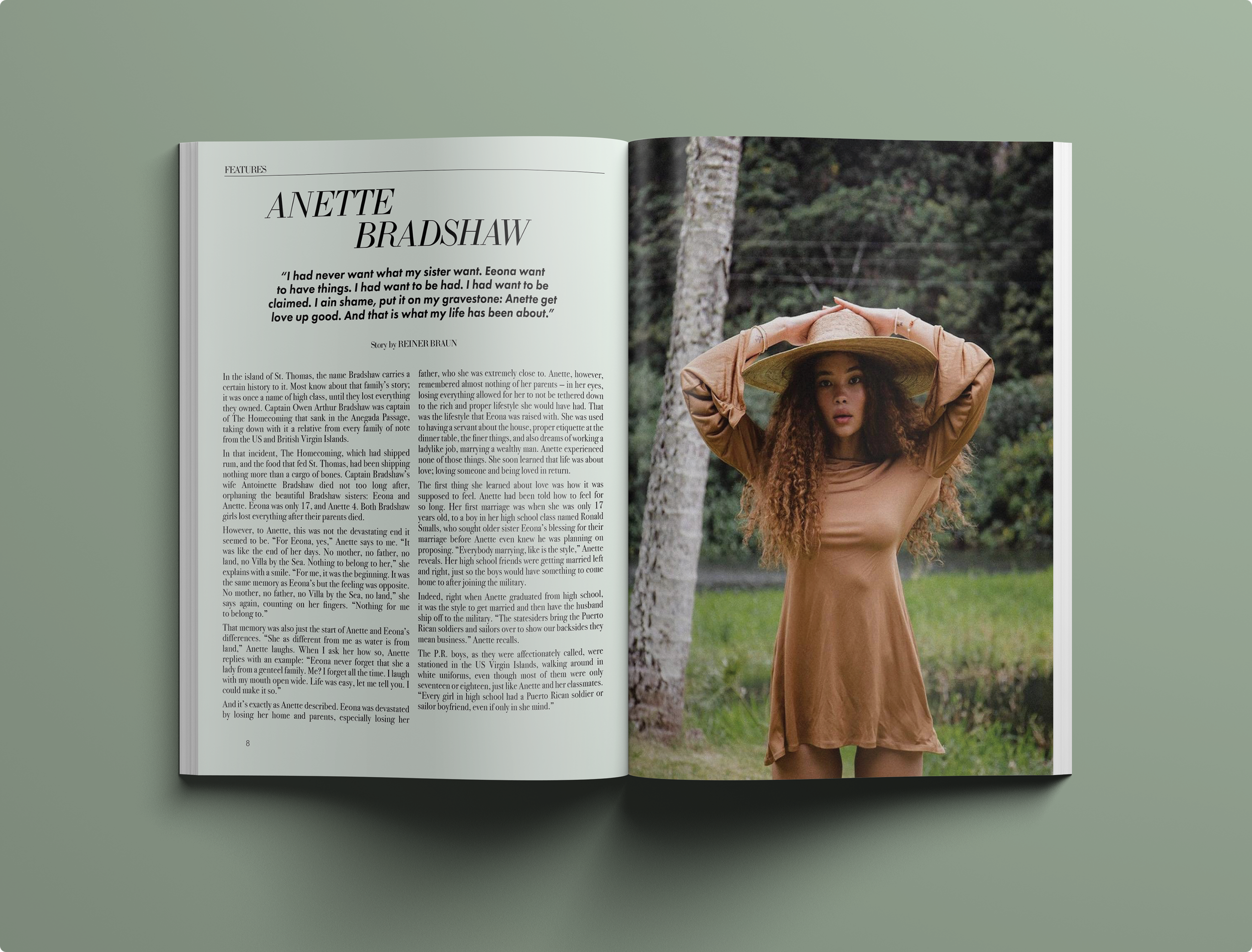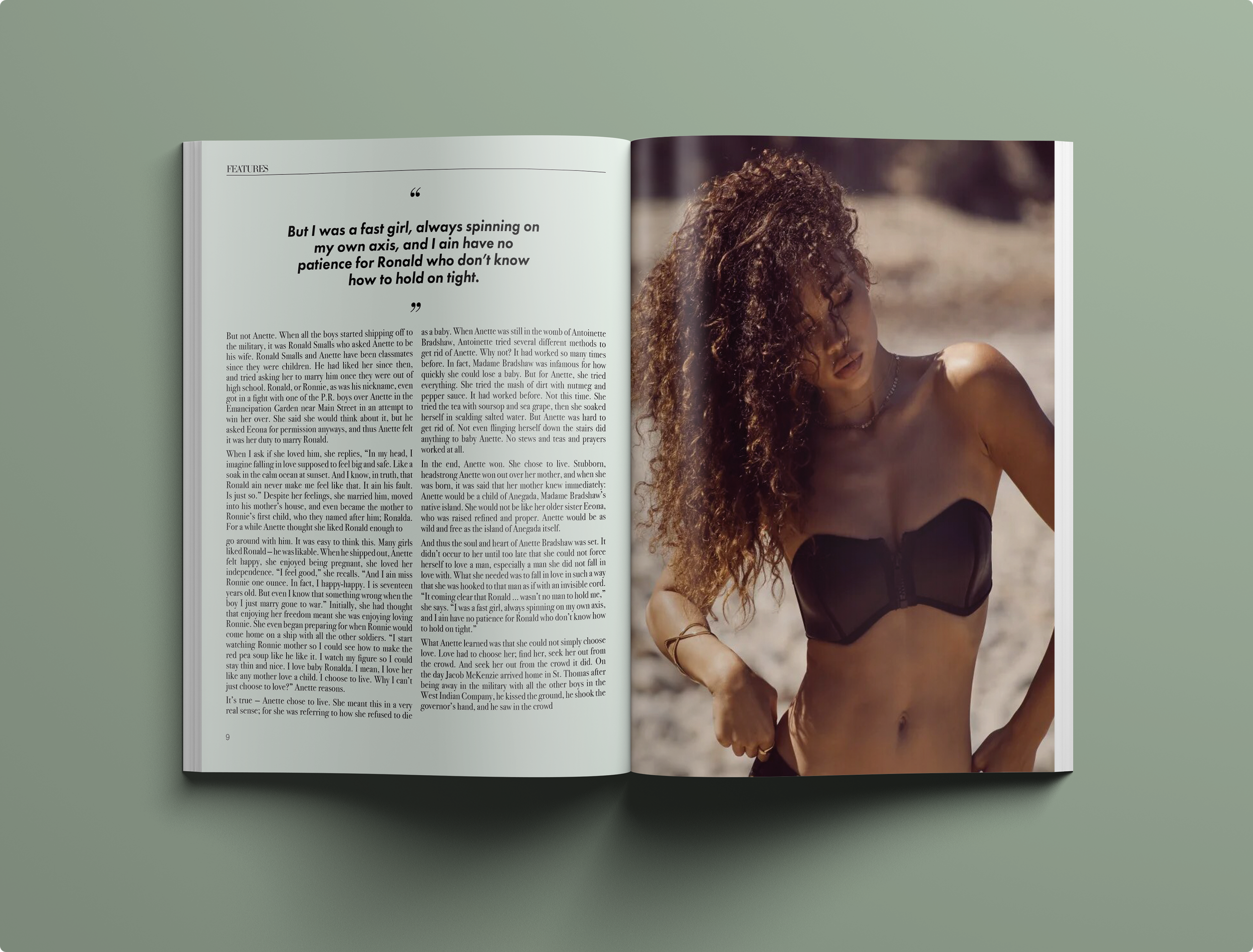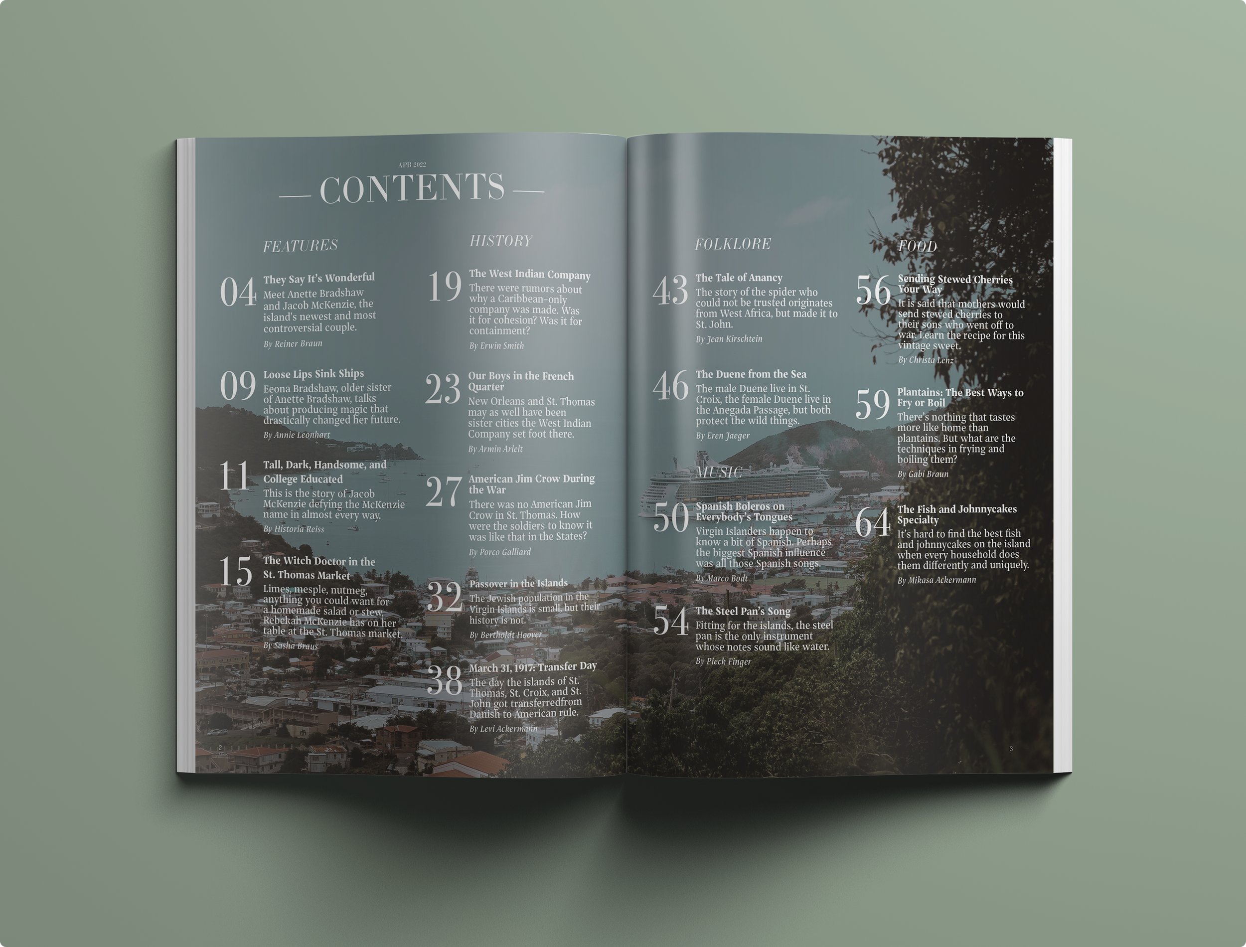 The Virgin Islander is a fictional lifestyle magazine about life and love on the U.S. Virgin Islands, and this particular issue focuses on characters from the novel Land of Love and Drowning by Tiphanie Yanique. The character names and storylines are entirely from the book, and this magazine brings that story to life.